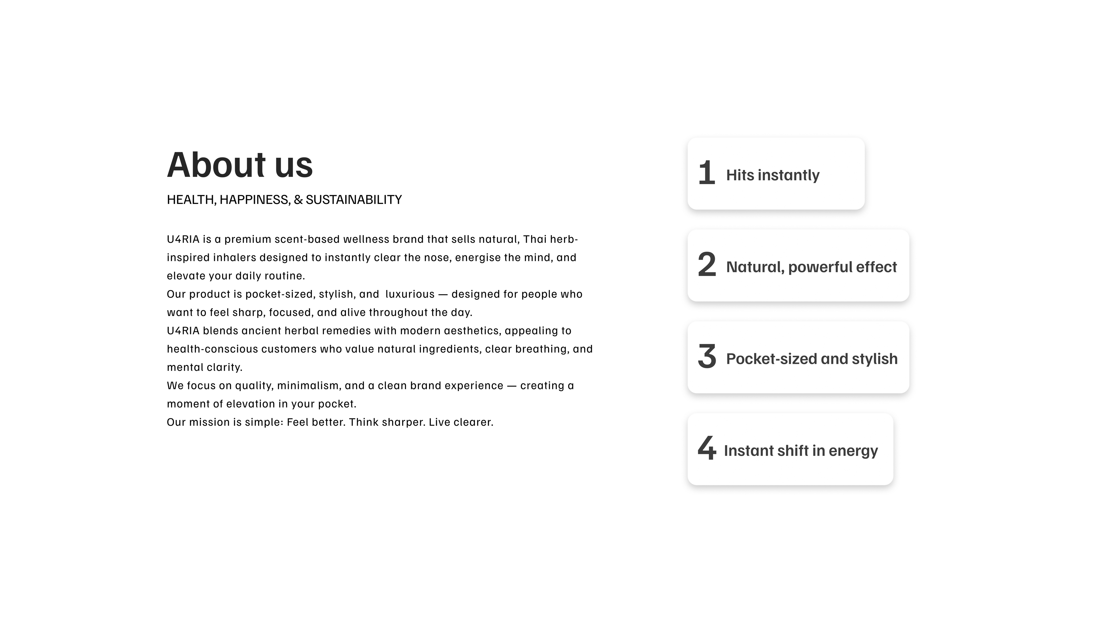 U4RIA is a natural scent blend designed to deliver a powerful experience. It’s built around a traditional Thai herb used for its intense aromatic effect — just twist, sniff, and feel the difference.