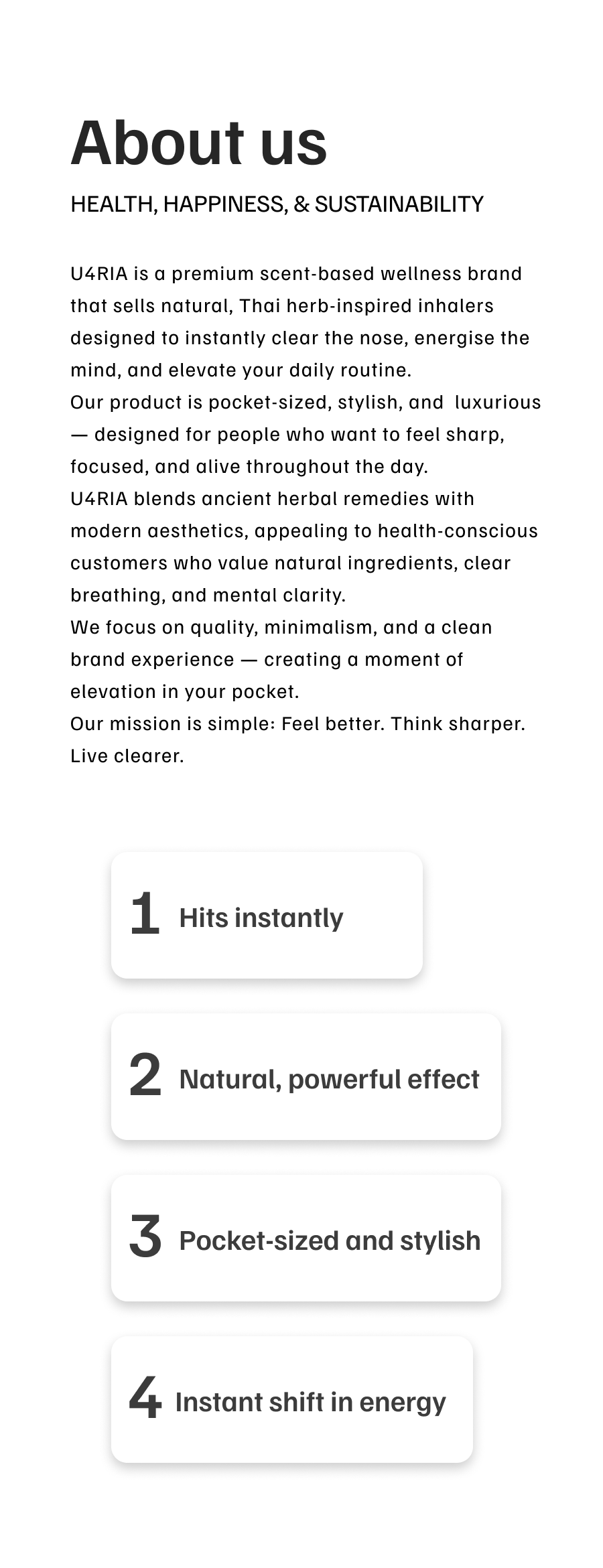 Designed with a sleek, travel-ready body, U4RIA fits effortlessly into your pocket, gym bag, or car, ready whenever you need a sharp mental reset. Whether you’re at the gym, on the road, or deep in work, U4RIA provides that instant wake-up call—a clean, natural way to refresh, refocus, and recharge.